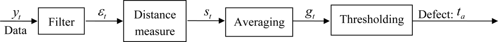 The sensor data (yt) is filtered. The filter estimates the radiation intensity (θt). The residual (εt) is calculated and, from this information, the distance measure is done. This value measures the difference between the sensor reading and the estimation given by the filter. The residual itself is an example of this distance. Then, it is done a statistic test (gt) based on the distance. Finally, gt is compared to a threshold (h) to decide if there is a defect in the weld. If the value is lower than the reference, it is assumed that the welding process is normal. But, if the statistical test value is greater than the threshold, it is possible that a defect occurred. There are many change detection algorithms. This work presents a widely used one, the Cusum LS Filter [16] and another is proposed, which applies steps from different algorithms.