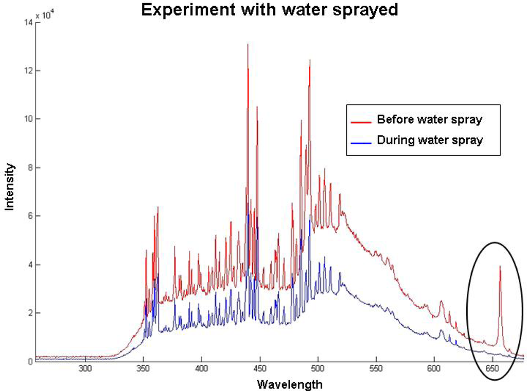 Spectrum before and during water spray.