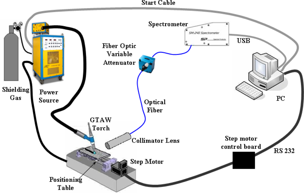 Some experiments were performed using proposals of electrical arc perturbations taken from a bibliographic review [5–8]. First, we performed a study to evaluate the spectrometer as a sensor capable of detecting perturbations at the electrical arc. For this task, the experimental scheme seen in Figure 3 was set up. The power source is a multiprocessor welding machine. The weld torch had a tungsten electrode with 2% thorium and 1.6 mm diameter. The shielding gas was pure argon. The specimens were SAE 1020 steel with ⅛” width. The plate was moved by a positioning table. The motor responsible for its movement was a Berger Lahr model IDS91 controlled by a board with a microcontroller. The data acquisition and the weld machine were controlled by a computer equipped with Labview software. The spectrometer was a Spectral Products model SM 240-USB. In all experiments, the spectrum taken was a three sample mean with 2 ms of integration time. The area focused on the plasma was between the electrode and the plate but not including them. A system with collimator lenses was responsible for focusing the lecture and transmitting to an optical fiber of Ocean Optics, code P200-5-UV/VIS. The light had its intensity attenuated by an Ocean Optics, model FVA-UV device to avoid signal saturation.
