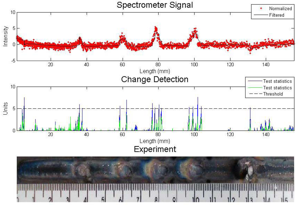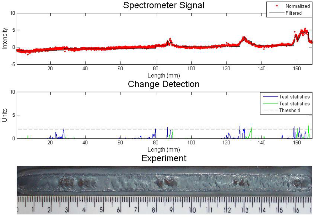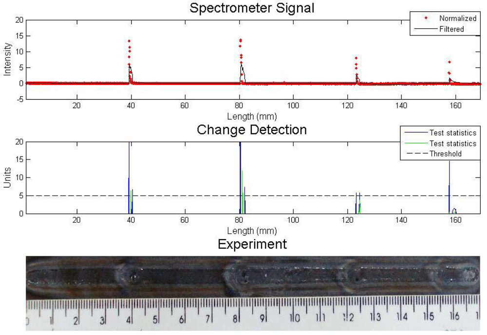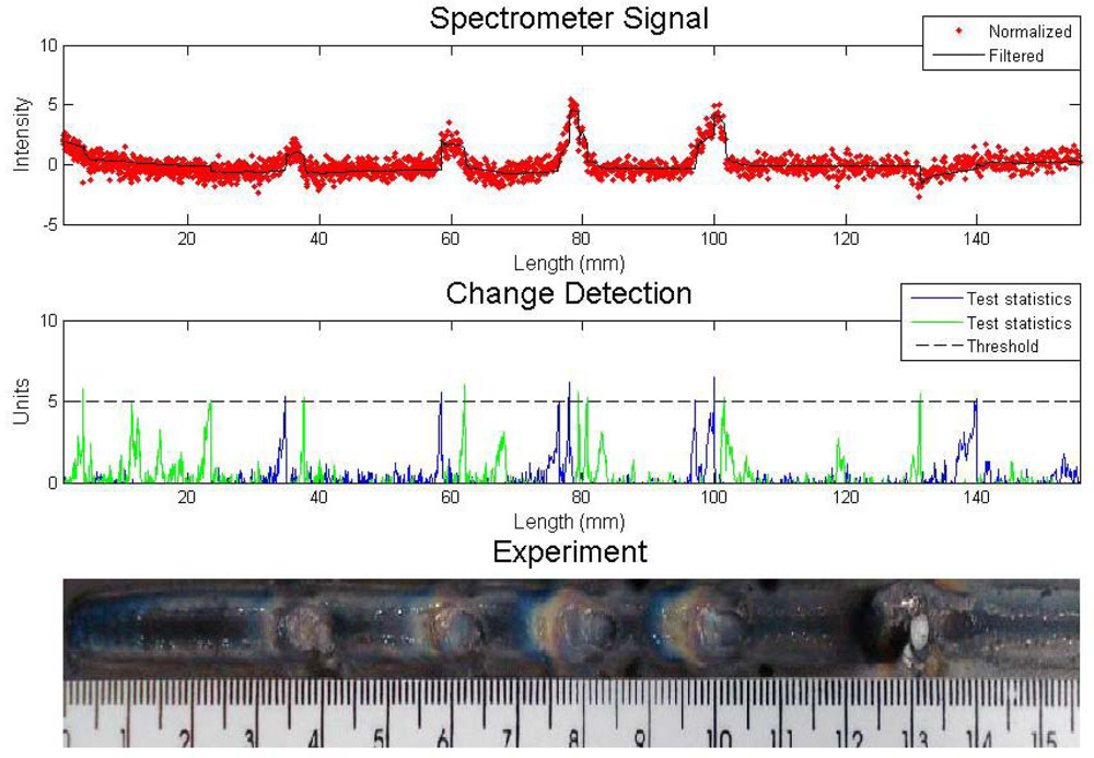 An experiment with metallic and sand inclusions is presented in Figure 4. The algorithm for defect detection was the Cusum LS Filter with σ = 0.5 and h = 5. The values are arbitrary and they are set to result in fewer errors, like false detection or lack of detection. One can see in the first graph the sensor reading and the result of the filter. The signal was normalized since the study is interested in the signal fluctuations, not its absolute value. The spectral line chosen was iron at 487.8 nm. Welding parameters were current 90 A, stand off 7 mm, welding speed of 2.5 mm/s and gas flow rate 10 L/min.