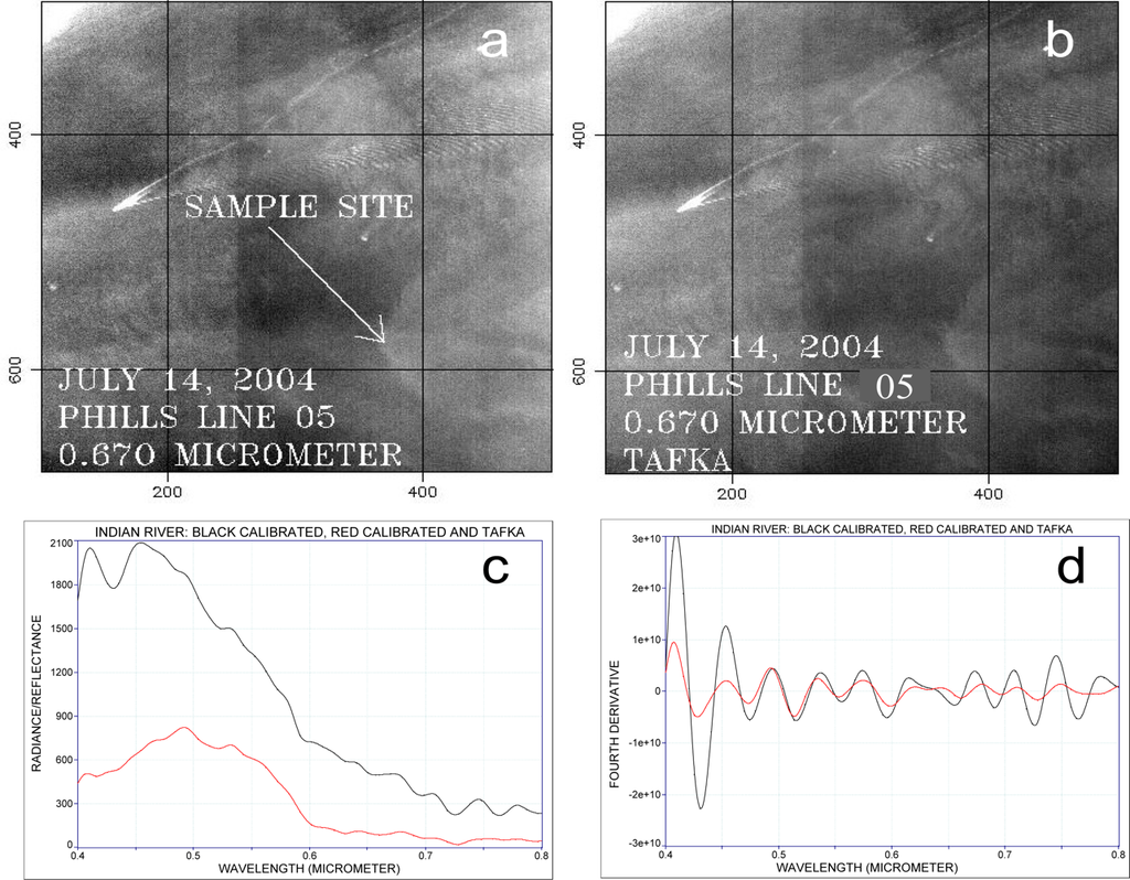 PHILLS data over the Indian River, FL. a: Calibrated data without atmospheric corrections. b: Calibrated and atmospherically corrected data. c: Radiance data (black) and atmospherically corrected reflectance data from sampling site in Figure a. d: Fourth derivative for spectra shown in Figure c.