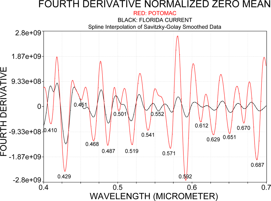 Fourth derivative of mean zero normalized spectra obtained over the Florida Current and a bloom in the Potomac (refer to Figure 9), both at 5 nm spectral resolution.