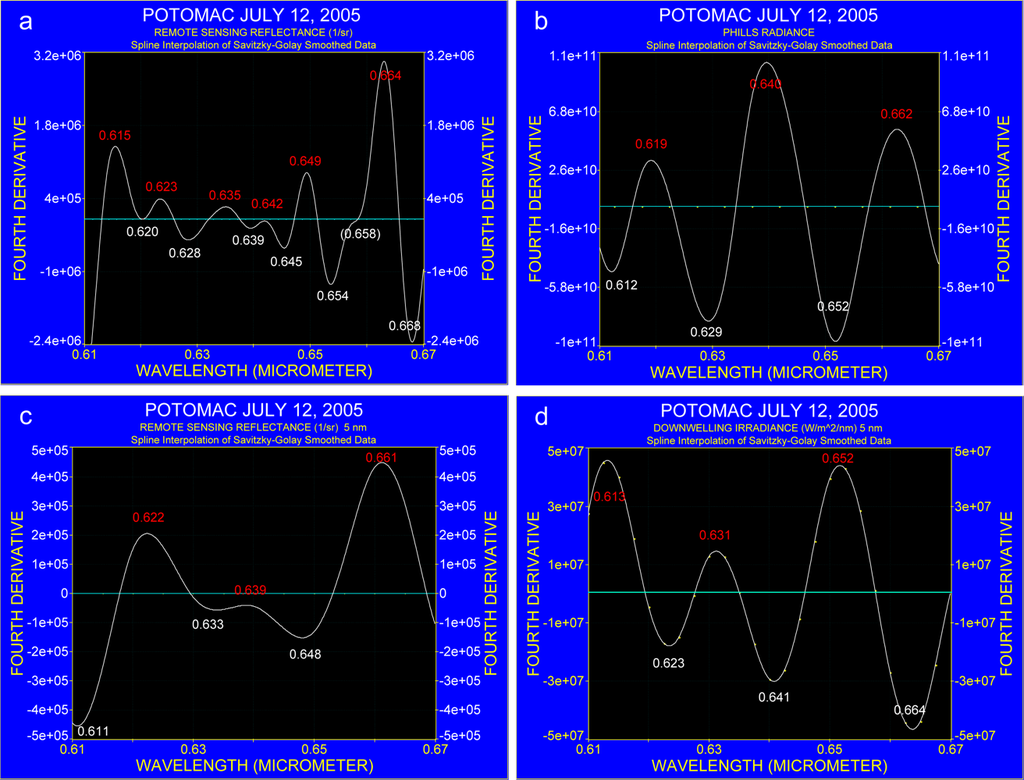Fourth derivative spectra of a cyanobacteria bloom in the Potomac River on July 12, 2005. Numbers in white indicate the spectral location of a trough and numbers in red the spectral location of a crest. a: Remote sensing reflectance (original data expressed as Rrs in sr−1) taken aboard a research vessel at spectral resolution of 1.4 nm. b: Radiance spectrum is measured with PHILLS at 5 nm resolution (original data expressed in W m−2 sr−1 μm−1). c: Spectrum shown in Figure 11a degraded to a spectral resolution of 5 nm. d: Downwelling irradiance Ed (original data expressed in W m−2 nm−1). Note that the magnitude of the y-axis varies in the different figures.