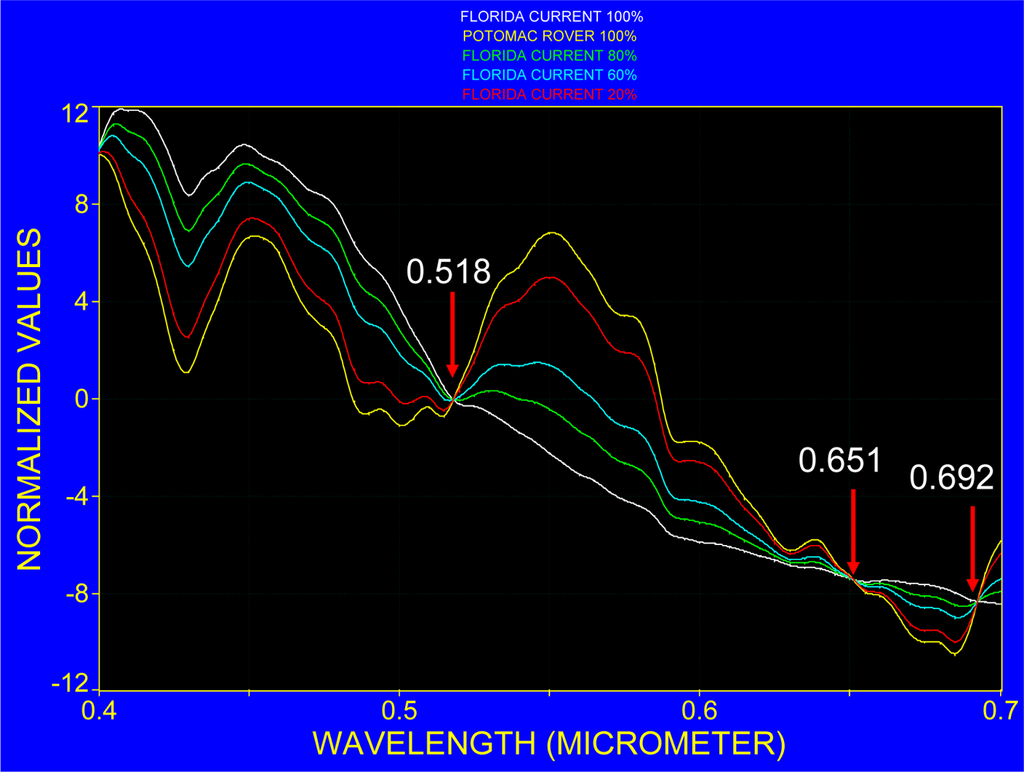 The recognition of phycocyanin is based on the high cell density in the cyanobacteria bloom that may build surface scum with a spectral response that resembles that of vegetation. In order to demonstrate the possible spectral change with respect to changing cell concentrations, the normalized spectra shown in Figure 9 were further processed to simulate a concentration gradient from coastal water (Potomac River) to Case 1 water (Florida Current) by mixing their spectra at different proportions. The resulting spectra and their fourth derivative are presented in Figures 12 and 13. Although this procedure assumes linear mixing between two water masses and ignores any physical and chemical changes during the mixing process, it highlights the fact that at certain parts of the spectrum, the absorption bands interact and introduce a spectral shift, change in slope and show variation in their amplitudes. This is visible in particular at around 0.46, 0.5, 0.55 and 0.62 μm.