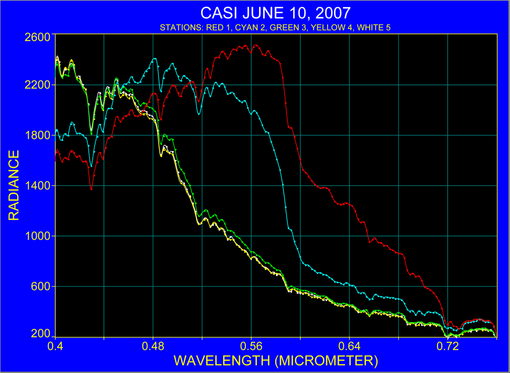 CASI data showed noise that was partly suppressed with an enhanced Lee filter by sub-setting spectrally the CASI bands 12 (0.3988 μm) to 165 (0.7601 μm) with a filter size 3 and a damping factor of 1. Output data were further processed with ENVI (ITT, Boulder, CO) and TableCurve (Aspire Software, Ashburn, VA) software packages. To further improve the signal to noise ratio in the data, the collected spectra were locally averaged. PHILLS data was collected in the Potomac River over a plankton bloom on July 12, 2005. The final data used in this analysis had a spectral resolution of 5 nm.