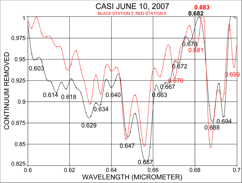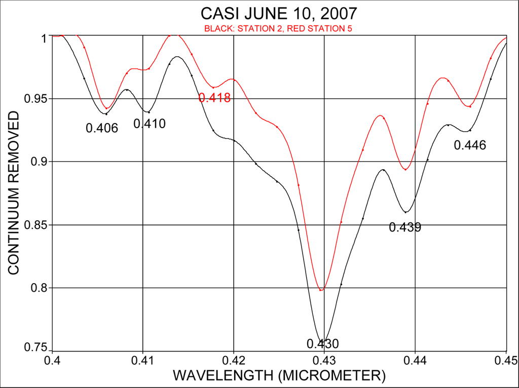 For this particular experiment, the spectral resolution of CASI was set at 2.4 nm. The spectral range examined was between 0.4 μm and 0.7 μm where most photosynthetic pigments show absorption. This range also covers the location of the major Fraunhofer lines (in particular at 0.431 μm) and the oxygen absorption band at 0.687 μm; both were used as references for testing the spectral accuracy of the measurements. The data were not atmospherically corrected and it was assumed that during the short flight no major atmospheric changes took place, an assumption that may not be necessarily accurate.