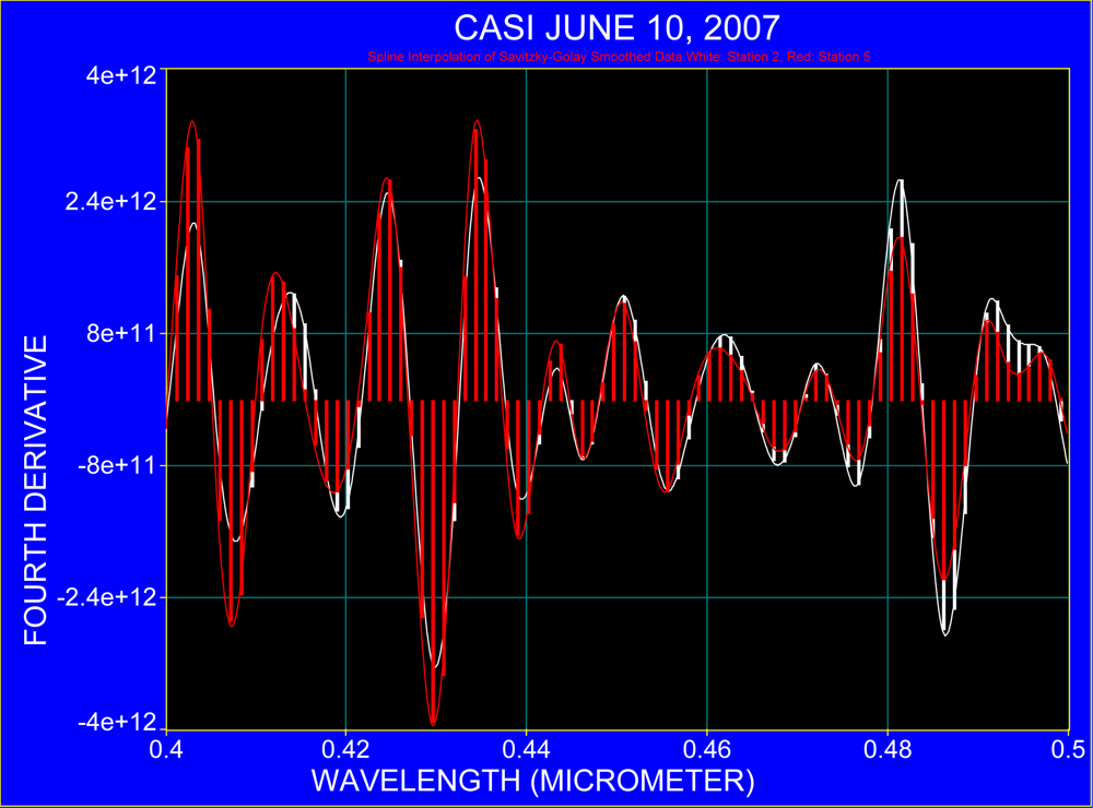 A major uncertainty in interpreting radiance data with the fourth derivative is the impact of the atmosphere and the removal of its affects from the measured at-sensor-radiance. Standard atmospheric corrections applied to open ocean water (Case 1) often fail in the case of multi-component water (Case 2) because the assumption of a “dark pixel” (only atmospheric contributions to the measured radiance above ∼0.8 μm) is not valid. High radiance levels above 0.8 μm are frequently observed over dense plankton populations or waters with high sediment loads [5,7].