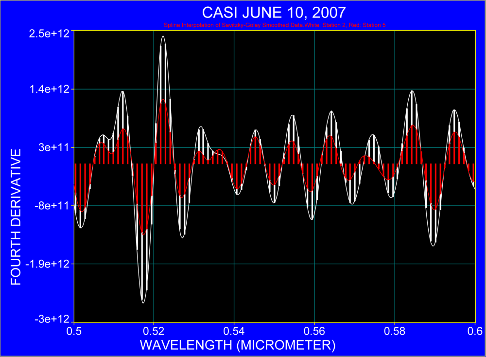 The fourth derivative applied to the averaged spectra at station 2 (white) and station 5 (red) for the spectral region 0.5 μm to 0.6 μm.