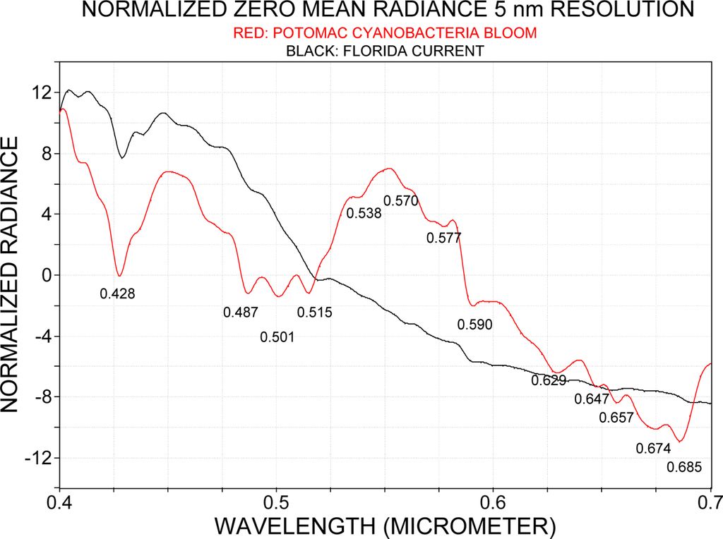 Comparison of zero mean average spectra obtained over the Florida Current on June 10, 2007, and a cyanobacteria bloom in the Potomac River on July 12, 2005. Both spectra are shown at 5 nm spectral resolution. Original units for the Florida Current are in digital numbers and for the Potomac River data were in W m−2 sr−1 μm−1.