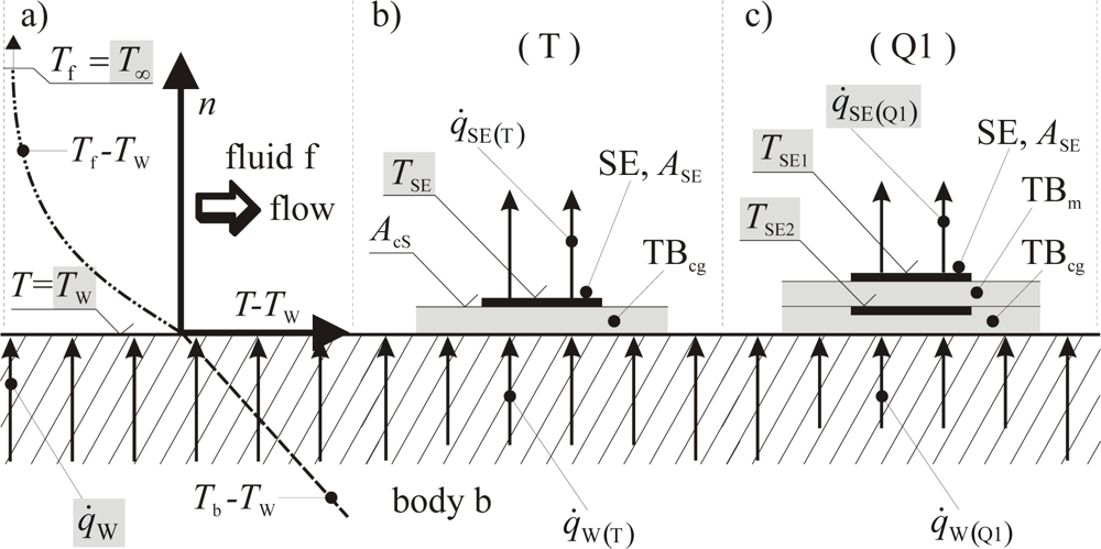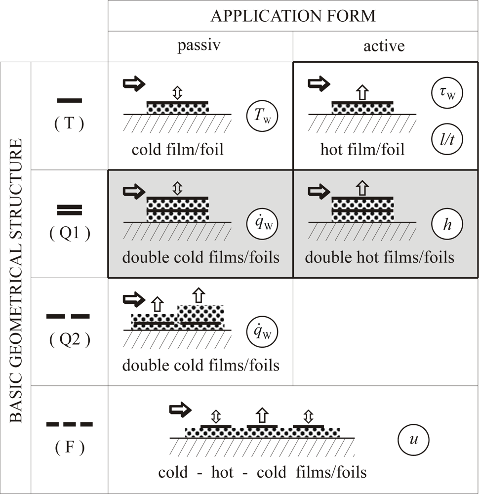 - Time resolved measurements require small response times. These time constants are characteristic not only of the TSE but also of the complete sensor on the body under observation. A complete sensor consists of one or more SE, the substrate or carrier on which the SE are mounted, glued or deposited and a casing if requiered. In order to get small response times the sensor should be as small as possible, especially with respect to its heat capacity. The SE should be in good thermal contact with the object under consideration. In the case of wall temperature measurement ((T) passive in Figure 1) a good thermal contact to the body must be guaranteed. For wall shear stress measuremens with a hot-film ((T) active in Figure 1) a good thermal contact to the fluid and a good thermal insulation against the body are requiered.