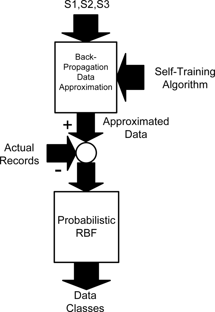 In our study, to wirelessly process the data, the data are first approximated by a dynamic backpropagation mechanism and then classified by a probabilistic radial basis function (RBF) network implemented on a wireless sensor network, seen in Figure 1. Using two different ANN architectures leads to flexibility and higher accuracy of approximation and classification mechanisms. The data approximation is carried out for temperature and humidity records of different positions in a food transportation truck. After the data are approximated, they are compared with current values, thereby generating so-called approximation residuals. Finally, according to the structure of the probabilistic RBF classifier, the data are classified into one of several predefined classes. The defined classes are used to evaluate reliability of the records in wireless sensor network. Therefore, the applied backpropagation algorithm approximates the records of each node which is processed by an RBF classification network to detect any abnormality in wireless sensor network.