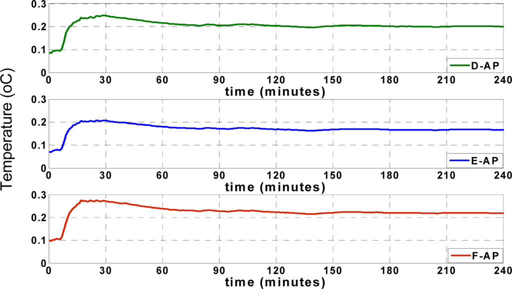 Figure 11 shows the ARMSE of each of the three tested cases for temperature records when the approximation platform (AP) was located at points D, E, or F.