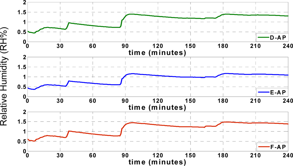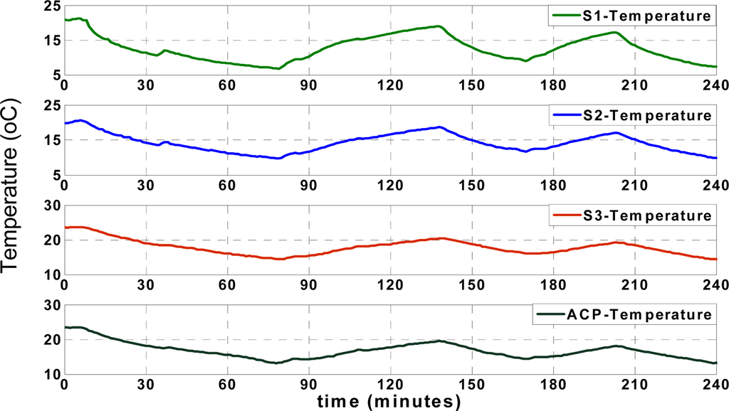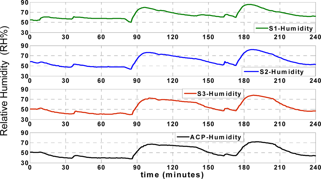 In this research, first the “data request” message from ACP is sent for each sensor node every 2 seconds respectively according to predefined scenario; every two seconds the ACP collects data from each node and it takes 6 seconds to collect data from all sensor nodes by ACP. It means that the ACP starts 3D approximation and classification after collecting data from all three sensor nodes (3D denotes approximation of data for each sensor node using the other three nodes). Otherwise, the algorithm is able to switch to 2D (2D denotes approximation of data for each sensor node using two other faultless nodes) or even 1D approximation depending on the available received records in ACP [36]. Also, data collision is prevented in this application due to the applied “data send/receive” scenario. The humidity records of the aforementioned points (SACP, S1, S2 and S3) are illustrated in Figure 6;