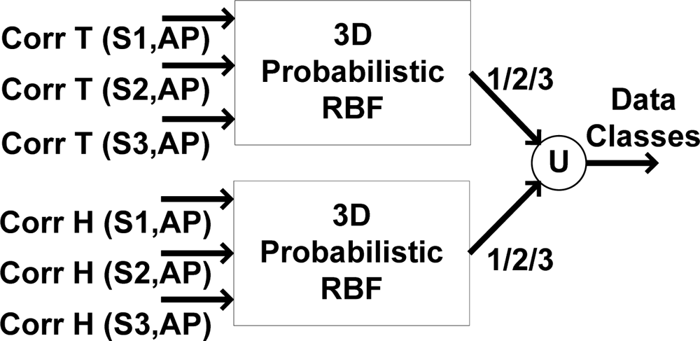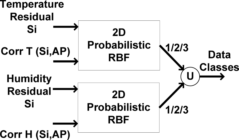 The applied 2D RBF mechanism is seen in Figure 14. According to Figure 14, by using the absolute sliding correlation factor of recorded data with AP and the approximation residual (as 2 dimensions of input vector), the class of recorded data is obtained using probabilistic features. The function (identified by U) denotes combining the results of the applied classification mechanism for temperature and humidity sensors, respectively.