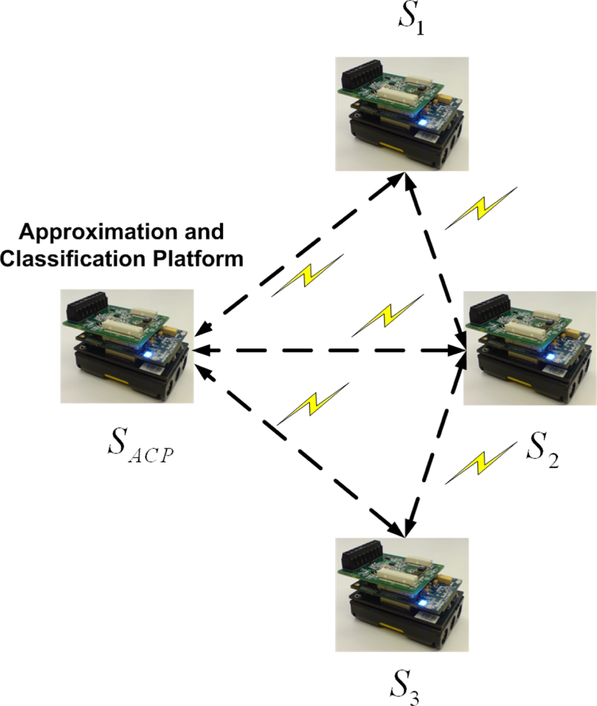 As mentioned, we propose an application of two joint mechanisms for wireless data approximation and classification in food transportation. For this purpose, the Imote2 kit is used to record temperature and relative humidity and to process the recorded data. The kit consists of three main components, including a radio/processor board, a sensor board, and a battery board [34,35]. All algorithms are executed in a wireless sensor network. One of the sensor nodes is selected as an “approximation and classification platform” (ACP) which works as “approximation platform” (AP) and also “classification platform” (CP). It is possible to assign the task of data approximation and classification to each individual sensor node, but the resultant increased data transfer and inference would raise energy consumption. Each temperature and humidity record is sent and received via the Imote2’s CC2420 radio, and the data obtained from all nodes are processed on the ACP. Figure 2 illustrates the architecture and location of each sensor node. There are three sensor nodes that communicate with the ACP.