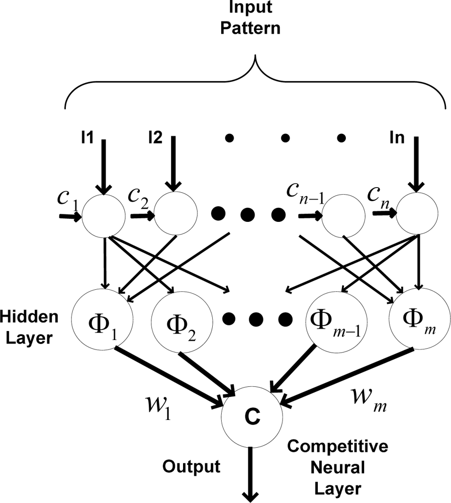 Different nonlinear functions, such as “multi-quadratic” and “spline”, are used to calculate the output of each hidden neuron. In this paper, the “Gaussian function” is used as the nonlinear function for the hidden neurons, which results in a nonlinear mapping between the inputs and classes.