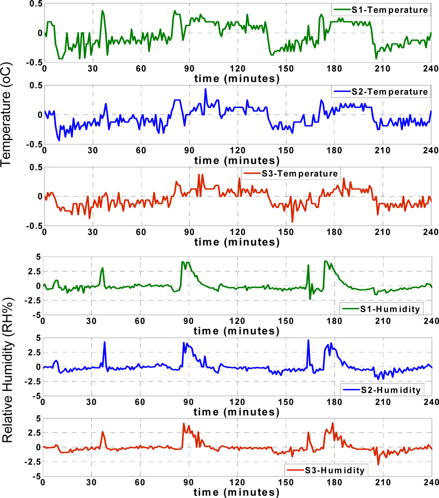 TActual and HActual denote the instantaneous actual recorded temperature and humidity. TNetwork and HNetwork are the approximated temperature and humidity values of each sensor node. The temperature and humidity residuals (ΔT, ΔH) are shown in Figure 7.