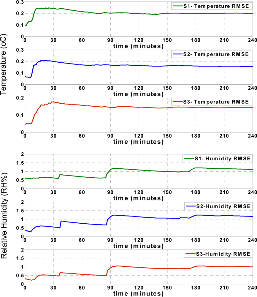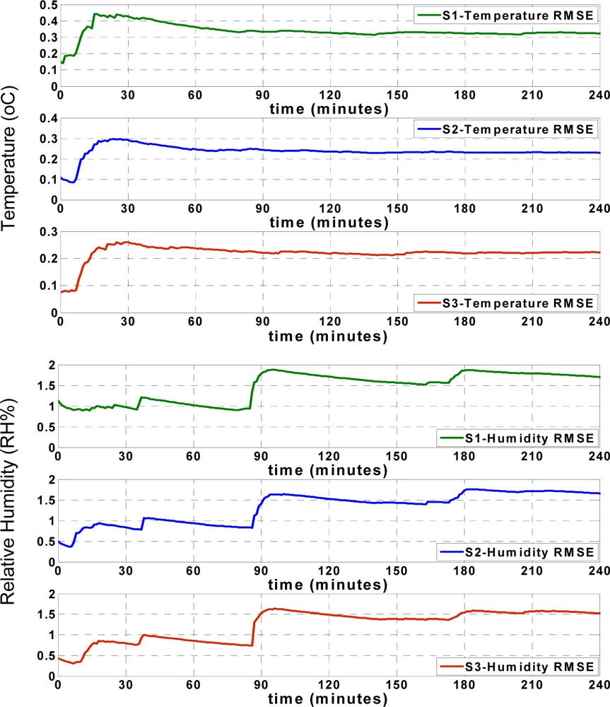 Figure 8 shows that the RMSE of the temperature records for each sensor node increases during the first minutes of approximation, and afterwards remains mostly steady. The humidity RMSE values indicate an especially prominent increase when the approximation values show significant deviation from the actual values, as seen in Figure 7. However, similar to the temperature RMSE, the humidity RMSE changes slightly and after some time, remains mostly steady. These figures show that both the RMSE and approximation accuracy of the sensor nodes differ depending on the positions of sensor nodes in the truck, which will be subsequently discussed.