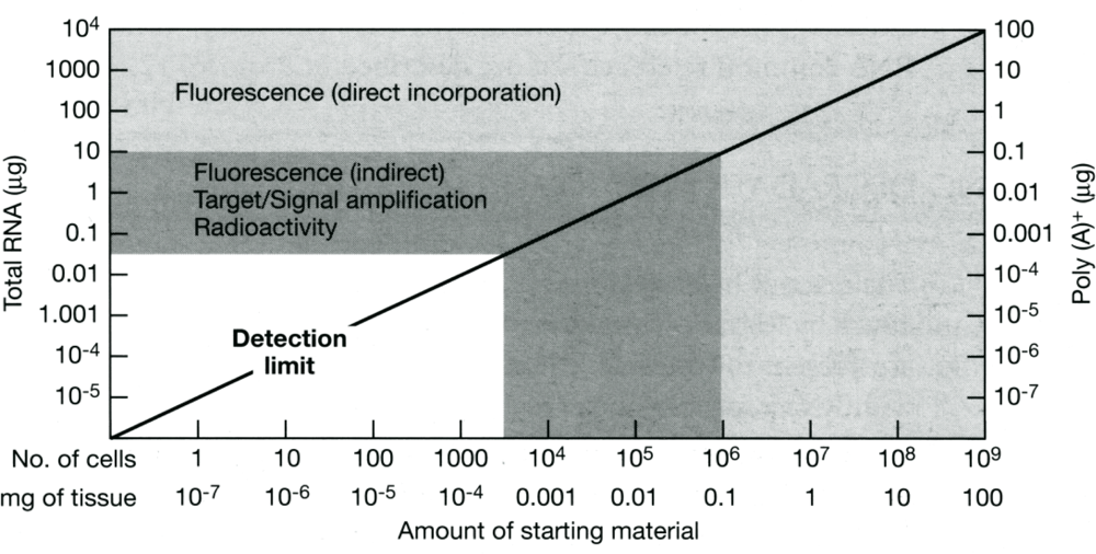 Description of the RNA amount utilized in the different microarray labeling techniques. The RNA amount is related to the cells number or tissue weight with a detection limit of 1000 cells. Direct incorporation of fluorescent nucleotides into the cDNA can be used to examine expression of samples with 10 μg of total RNA while indirect incorporation of fluorescent nucleotides is used with samples presenting total RNA concentration between 10 μg to 50 ng. Described detection limits do not preclude the use of the microarray to perform genome wide studies of biopsies or histological samples. Image reproduced from Duggan et al.[29].