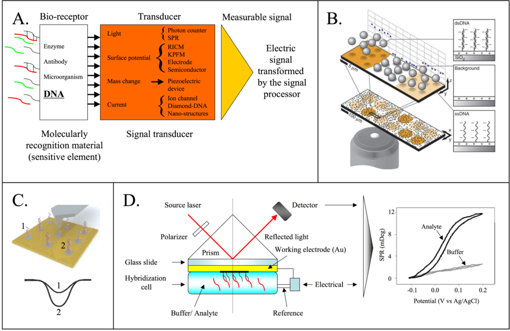 A). Scheme of a biosensor. The three main components of a biosensor are evidenced: the sensitive element (white box), the transducer with a list of different transduction methods (orange box) and the signal processor (yellow triangle) that displays the transformed signal in a user-friendly way. B). RICM method description. A suspension of negatively charged silica microspheres is gravitationally sedimented over a microarray surface allowing the electrostatic readout of microarray. The positions and motions of a population of microspheres are used to image the surface charge of the microarray and detect hybridization. This is caused by the higher negative charge of the areas displaying double-stranded DNA in comparison to those displaying ssDNA, and both contrast with the positively charged background. Image reproduced from Clack et al. [90] C). Schematic view of DNA probe in single (1) and double stranded (2) conformation (hybridized to target molecules) scanned by the KPFM method. Bottom image represents a typical KPFM response in which electrostatic potential is plotted against surface position. Point 1 and 2 evidence the different responses of the surface potential according to the absence (1) or presence (2) of hybridization with target. D). EC-SPR scheme. The combination of SPR and electrochemical techniques allows obtaining new insight in the interfacial recognition process. The cyclic voltammetry and the simultaneous measure of the SPR angle show a sigmoidal change between the oxidized and the reduced state of the analyte. The cyclic voltammogram and SPR response in the absence of the analyte are shown, for comparison.
