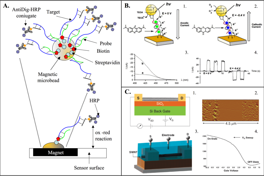 A). Schematic representation of the electrochemical strategy used for the detection of food pathogens by Lermo et al. [128]. Biotinilated probe is immobilized onto magnetic beads and hybridized with the target. Enzymatic labeling, magnetic capture of the modified magnetic beads by the magneto electrode and chronoamperometric determination are common steps for this strategy. B). Photochemical detection of DNA hybridization. The exposure of the CdS nanoparticles to visible blue light gives rise to a directionally electroswitchable photochemical current (1 and 2) between the nanoparticle and gold electrode. (3) Photocurrent action spectra generated in the CdS nanoparticles DNA system: in the absence (a) and in the presence (b) of methylene blue. (4) Electrochemically switched anodic and cathodic photocurrents generated in the Cd nanoparticles DNA in the presence of methylene blue generated at 0 and −0.4V. Photocurrents were generated upon irradiation at λ = 420 nm. Image reproduced from Willner et al. [130]. C). Carbon nanotubes field effect transistor. (1) A NTFET device composed of an isolated single-walled carbon nanotubes (SWNT) between source (S) and drain (D) electrodes on top of a SiO2 substrate with an underlying Si gate electrode. (2) An atomic force microscope (AFM) image of the NTFET device illustrated in part 1. (3) A liquid gated NTFET, where the electrochemical potential of the solution is controlled with a gate electrode. (4) NTFET transistor characteristic showing the source–drain conductance versus gate voltage (G–VG) curve obtained by sweeping the gate voltage from +10 to −10 V at a constant S–D bias voltage (VSD) of 0.05 V using a NTFET with a random network of SWNTs between interdigitated Ti/Au electrodes on a SiO2 insulated Si back gate. Image reproduced from Kauffman et al. [118].