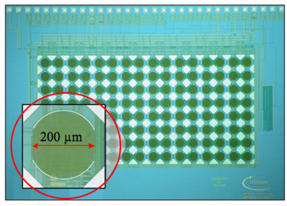 Microphotograph of a fully digital 16 × 8 sensor array (source: Infineon Technologies AG [150]). The chip is 4.15 mm × 5.65 mm; sensor pitch is 250 microns. Each site is an interdigitated gold electrode couple exposed to the solution.