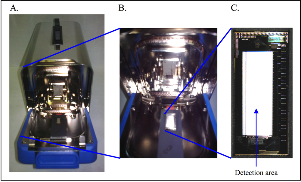 A. ElectraSense reader. B. Enlargement of the chip housing. C. Enlargement of the silicon chip with complementary metal oxide semiconductor (CMOS) circuitry. The central detection area shows 12k electrodes. Diameter of each electrode is 44 μm.