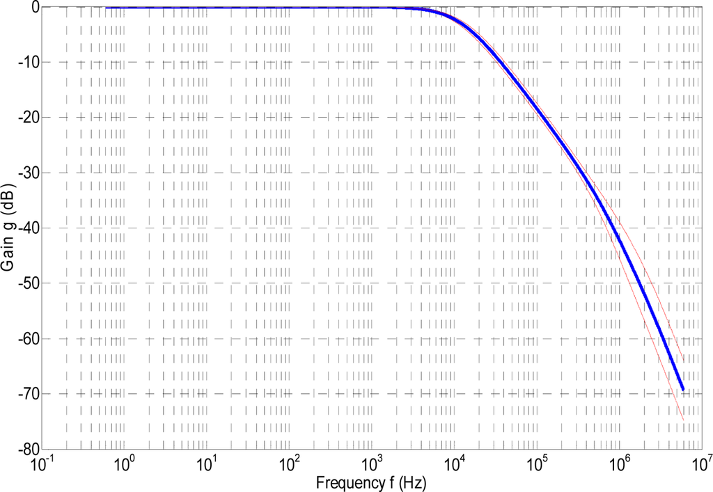 Again, the uncertainty propagation from the transfer function parameters gDC ≡ y1, y2, y3, ⋯, y7 to G(ω) = gDC · g(ω) and φ(ω) are calculated by using the procedure described in Section 3. At a specified frequency f, the gain and phase shift are functions of the parameters y2, y3, ⋯, y7: