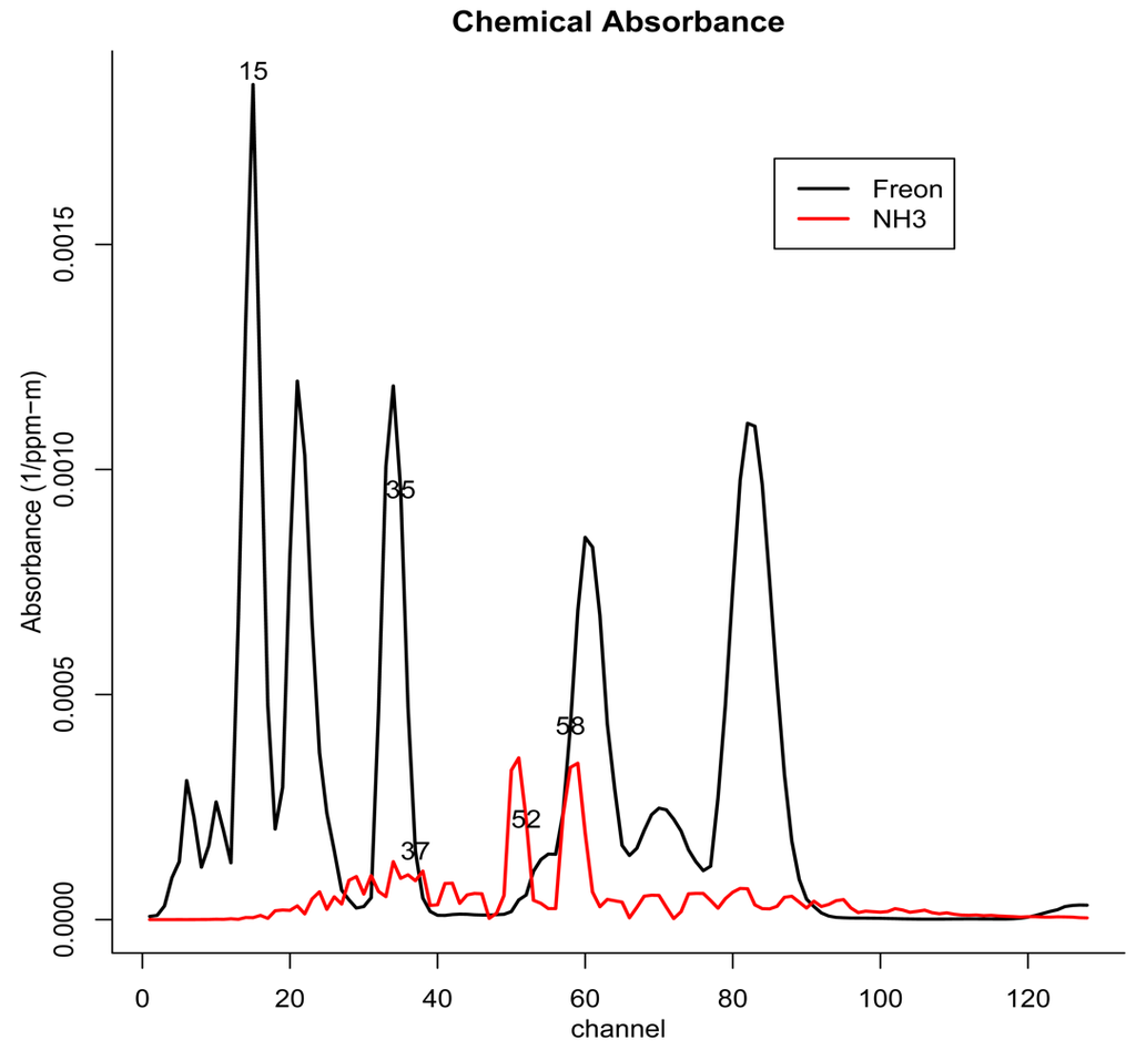 Chemical absorbance spectra for Freon-114 and NH 3.
