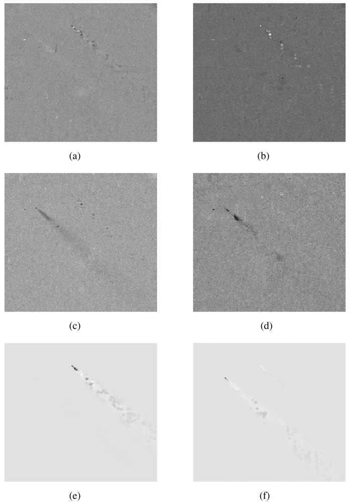 Figure 4 (e) shows gray scale contrast in the region of the Freon plume due to channel 35 using background-only whitening. It is a significant improvement over the scene-wide whitening results in Figure 4 (a) and (b), and it is almost identical to the background-only matched filter result for Freon in Figure 3(c). Figure 4(f) shows gray scale contrast in the region of the NH3 plume due to channel 52. It shows some improvement over the scene-wide result in Figure 4(c) and (d); and it is similar to the background-only matched filter result for NH3 in Figure 3(d), except it contains only very weak evidence of the Freon plume.