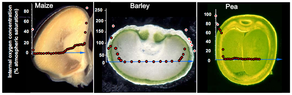 Seed development is an essential part of plant reproduction, and plant seeds are the basis for much of human and animal nutrition. One of the major aims of plant physiology research is to elucidate the molecular mechanisms underlying seed growth, and especially, to determine what constitute its most important limiting factors. A body of indirect evidence points to the presence of oxygen-deficient zones within the seed [1-5], and these are responsible for localized partial (hypoxia) or even complete (anoxia) inhibition of mitochondrial respiration. Under the former condition, the rate of mitochondrial respiration is governed by the sub-optimal concentration of oxygen present, while under the latter, respiration ceases because of a lack of oxygen required for ATP production. Oxygen deficits within the seed can, in principle at least, affect gene expression, enzyme activity, metabolite levels and metabolic fluxes [6]. Thus they determine the pattern of growth of the developing and/or germinating seed, with knock-on effects on the level of plant fitness and survival. Assuming that endogenous hypoxia is deleterious with respect to both seed yield and germinability, its reduction or prevention could be advantageous for plant productivity. However, a strategy based on this assumption needs to be supported by a detailed knowledge of the factors determining both the extent and the topological distribution of hypoxia. Oxygen-sensitive microsensors have provided a means to directly measure localized oxygen status within the developing seed of several major crop species (soybean, pea, maize, barley, wheat, sunflower and oilseed rape), delivering a picture of internal steady-state oxygen levels with a high degree of spatial resolution. These measurements have been used to generate oxygen maps, to characterize dynamic changes in tissue oxygen levels in response to environmental factors, and to monitor the rate of endogenous release of photosynthetic oxygen. Here we review both the relevant methodology and the major outcomes of applying microsensors to plant seeds.