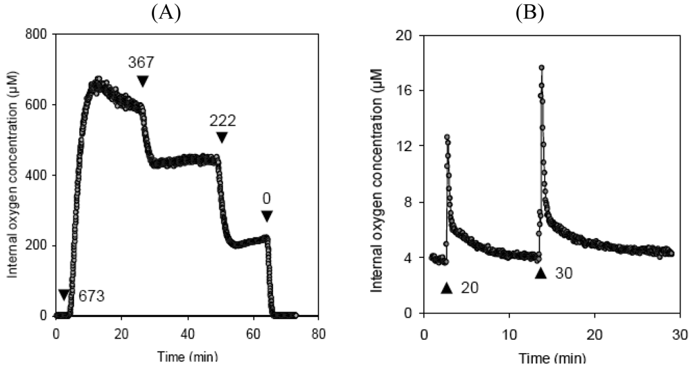 Most seeds are photosynthetically active during at least some stages of development. Light availability within the seed is limited to about 10% of incident radiation (soybean [17]; white lupin [24]; oilseed rape [25], but photosynthetic activity within the seed can be responsible for rapid changes in the steady-state oxygen concentration, as has been demonstrated by microsensor-based measurement of the effect of varying ambient light conditions (for experimental details, see [26]). An illustration of the outcome of this sort of experiment is given as Figure 2A, which plots the oxygen level 1 mm below the surface of an oilseed rape seed. In the absence of light, the level is < 2 μM, but when illuminated with 673 μmol quanta m-2 s-1, it rises instantaneously to almost 700 μM, and stabilizes at ∼ 600 μM. Stepwise reductions in light intensity result in an immediate response, which settles after some delay into a new, lower steady-state level. Thus seed photosynthesis can deliver significant amounts of oxygen, which can serve to relieve localized hypoxia (turning into hyperoxia!), and allows the green seed a means to stimulate metabolism in the presence of light.