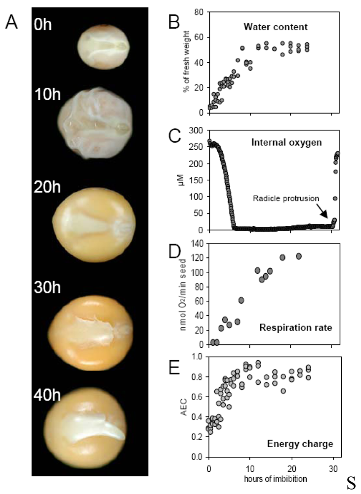 Morphological and biochemical changes during imbibition of seeds of pea (Pisum sativum L., var Baccara). (A) Visual changes of dry seeds (0 h) with swelling of seed coat (after 10 hours) and cotyledons (20 h), radicle protrusion breaking the seed coat (30 h) and radicle outgrowth (40 h). Concomitant changes were monitored for water content of the embryo (B), internal oxygen concentration (C), respiration rate (D), and adenylate energy charge (E). Data in (B-E) are taken from [36].