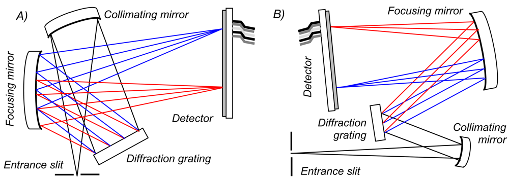 Schematic showing the operating principles of the spectrometers discussed here. Light enters the spectrometer through the entrance slit, is collimated by a curved mirror, then segregated into constituent wavelengths (e.g., blue and red) by a diffraction grating. These spectral components are then imaged onto discrete pixels of a CCD array detector, by a second curved mirror, so to obtain a spectrum. Both folded (A; e.g., OO) and non-crossed (B; e.g., Avaspec) configurations are shown. The figures are not to scale.