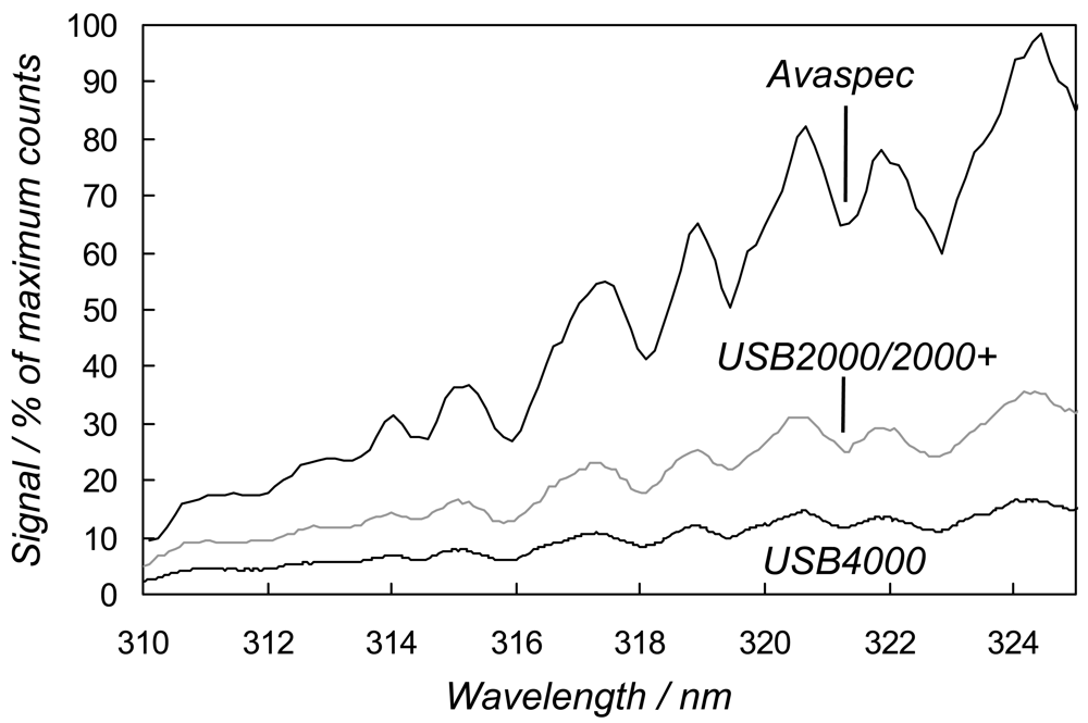 In order to characterise these phenomena, in respect of our application, we made a series of skylight spectral observations, on February 28th 2008 in Sheffield, under stable intensity clear sky conditions, by coupling the spectrometers via optical fibres (Avantes FCRL-4UV200-2-SR) to co-aligned, home made, single plano-convex f = 100 mm lens, vertically pointing telescopes. Sample 170 ms exposure time spectra for the Avaspec, USB4000 and one USB2000+ are shown in Figure 2, the latter as a representative of the rather similar performance of all the USB2000/2000+ units. The Avaspec displayed higher sensitivity in the ≈ 310-325 nm spectral region, used for the SO2 measurement, than the OO devices, with the USB2000/USB2000+s returning around double the signal of the USB4000. This is likely caused, to a large extent, by: 1) the fundamentally higher resolution of the Avaspec optical bench, which allows use of a diffraction grating of fewer lines/mm to realize the desired ≈ 0.65 nm resolution, so providing enhanced light throughput characteristics; and 2) the splitting of the incident light into 3648 pixel increments, in the case of the USB4000's detector, each of correspondingly lower intensity than captured by the other units' 2048 element detectors. These sensitivity data are further illustrated in Table 1, which shows the light signals recorded at 320 nm from each spectrometer. Note that due to the relatively low cost of these units, the performance in each evaluation, per spectrometer type, though broadly similar, would not be expected to be absolutely identical.
