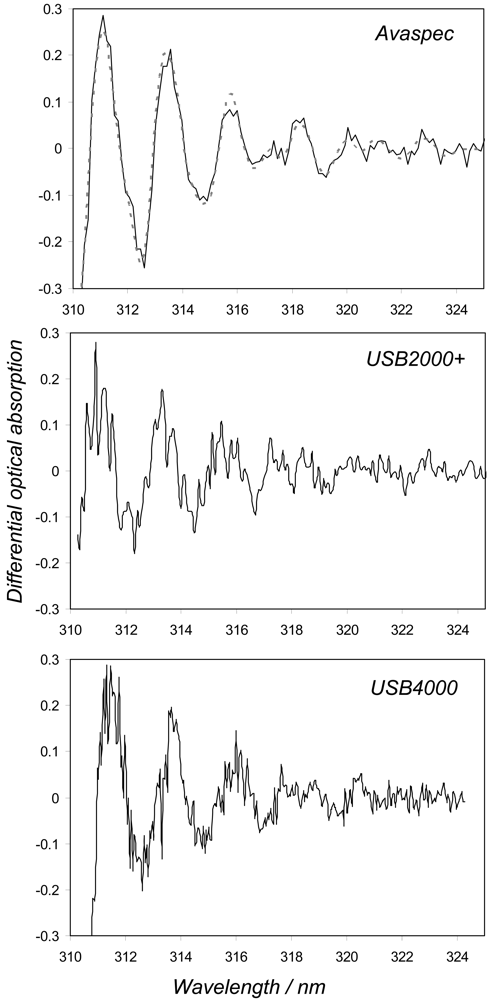 From the perspective of random error in the cell spectral measurements, the Avantes, as with respect to systematic errors, performed the best of the analysed spectrometers in this study (e.g., concentration standard deviations of 29 and 16 for the 1600 and 400 ppmm cells, respectively vs. 50-78 and 24-43 for the OO spectrometers, for the stray light corrected data) as a result of its higher light sensitivity/dark current noise characteristics (Table 1). Indeed, it is clear from the differential absorption spectra shown in Figure 3, corresponding to 1600 ppmm cell measurements, taken with the Avaspec, USB4000 and USB2+E001 (taken as a typical representative of USB2000/USB2000+ behaviour), that the former data are less noisy. These experiments were deliberately performed with identical exposure and data evaluation procedures in order to provide the most equivalent inter-comparisons. However, due to the better stray light characteristics of the Avaspec, the start pixel of the fit window could be reduced here, with no drop off in retrieved concentrations, further improving upon its standard deviations, by including more pixels in the fitting.