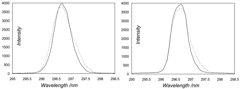 Thermal variation in the profile of the 296.7 nm line in the Hg lamp experiments. Traces at 12 °C are dashed, and solid for 32 °C, showing heating induced line narrowing from ≈ 0.8 nm to 0.65 nm for USB2G1110 (left) and from ≈ 0.7 nm to 0.6 nm for USB2G2385 (right).