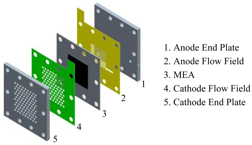 In this work, transparent μDMFCs were designed and fabricated. The fuel cells ran on aqueous methanol solution which was driven by a syringe pump in the anode and absorbed oxygen from the ambient air (air-breathing mechanism) in the cathode. As shown in Figure.1, the μDMFC consists of MEA, flow field plates and end plates. The MEA with an active area of 1.4 cm × 1.4 cm was sandwiched between two flow field plates, which were sealed with PTFE gaskets on both sides. The MEA was supplied by Dalian Institute of Chemical Physics, the fabrication process was described in our previous work [20]. The flow field plates were made of stainless steel sheet (SS316L, 400 μm in thickness) using double-sides photochemical micro fabrication techniques. The end plates were made from 2mm thick polymethyl methacrylate (PMMA) sheets using a laser milling method.