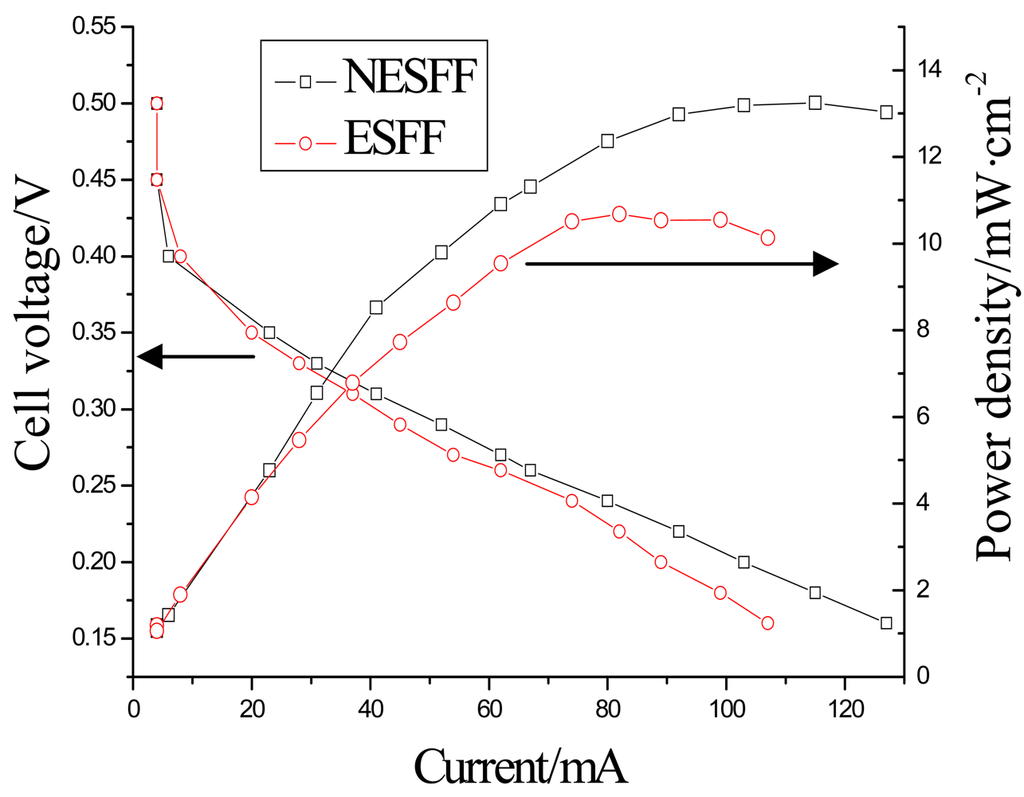In order to further prove the benefits of the NESFF, μDMFC performance with and without this kind of flow field pattern were compared in this study. The fuel cell performance usually can be evaluated using a polarization curve (IV curve). However, the difference of the internal resistances between these two fuel cells should be adjusted to an acceptable scope before the performance evaluation. Figure 9 shows the Nyquist plot of the μDMFC impedance with and without NESFF in anode, which was obtained by using an electrochemical workstation (CHI660A, CHInstruments Inc.). Results show that the internal ohmic resistance of the μDMFC with ESFF and NESFF patterned anodes were 350 mΩ and 420 mΩ, respectively. The slight difference of the internal resistance is due to different assembly conditions of the fuel cells. Figure 10 presents the performance of the μDMFCs equipped with NESFF and ESFF using 3 M methanol solution at a flow rate of 3mL/h (temperature is 25°C). Moreover, as it can be seen from Figure 10, the power density difference between the two μDMFCs was enlarged with the increase of the fuel cell current (also means the increase of the quantity of the CO2), and the peak absolute power of the NESFF μDMFC (25.97 mW) was 24% higher than that of the ESFF μDMFC (20.91 mW). This may also be attributed to the effects of the anode flow field pattern on the CO2 clogging behavior that have been analyzed in above paragraphs.