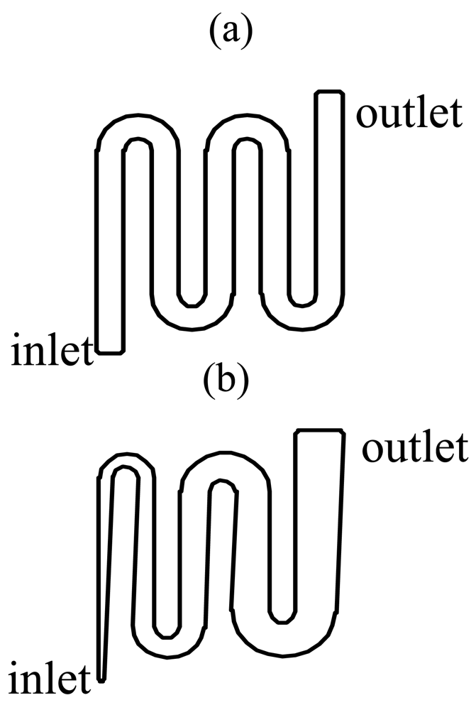 The above mentioned research has provided effective methods to investigate the behavior of CO2 bubbles and mitigate their adverse impact on performance of the DMFC. However, with the significant feature sizes decreasing of the anode flow channels in μDMFC, especially the hydraulic diameter of micro channels is less than 1 mm, CO2 clogging may become a vital limitation for a further performance improvements of the fuel cell [19]. In order to mitigate the clogging of the CO2 bubbles in the middle and export region of the flow field [14], a new anode flow field pattern for μDMFC with gradual change in width along the micro channel was demonstrated in the present work. We call this type of flow field as non-equipotent flow field in order to distinguish it from the conventional flow field patterns. Transparent μDMFC single cells with and without this flow field pattern were fabricated and comparatively studied. Preliminary results showed that the μDMFC performance was effectively promoted using the designing concept of non-equipotent flow field.