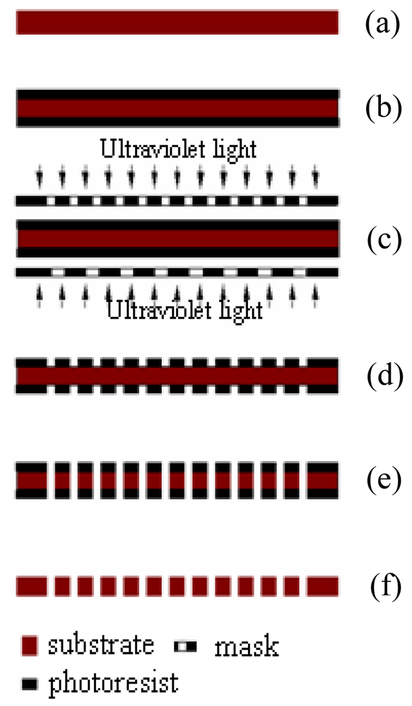 The flow field plates with a minimum channel dimension of 400 μm were fabricated using double-sided micro photochemical etching. The fabrication sequence is shown in Figure 4. The cleaned and dried stainless steel substrate (SS316L) (a) was spin-coated with one SU-8 photoresist layer with a thickness of 10 μm on both sides (b). Then, the flow field patterns on the mask were transferred to the photoresist layers using UV-based lithography techniques (c), and developed using a 1% sodium carbonate developer (d). The flow field patterns were obtained after etching in FeCl3-HCl for 30 min (e), and the residual photoresist was removed using NaOH solution at 50°C (f).