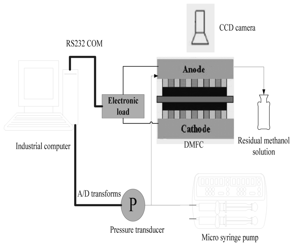 In this study, the effects of CO2 bubbles were characterized using the inlet-to-outlet pressure drop and the two-phase flow behavior in the channels of anode flow field. On the other hand, the performance of the μDMFC was examined using an electronic load. Figure 5 shows the schematic drawing of the experimental test loop. In the test loop, a high accuracy syringe pump (Medical Instrument Corporation of Zhejiang University, WZS-50F2) with double channels was used to deliver methanol solution to the μDMFC. A programmable electronic load (Itech Electronics, IT8511) was adopted to simulate the variation of the external load during the test. The inlet-to-outlet pressure drop in anode flow field was monitored with a pressure transmitter (Beijing Westzh M&E Technology Ltd, CYB-3051). The CCD camera (Toshiba Teli Corporation, CSFU15BC18) was adopted to record the two-phase flow behavior in the flow channels. The experimental data and flow behavior were acquired and analysed by a real-time computer.