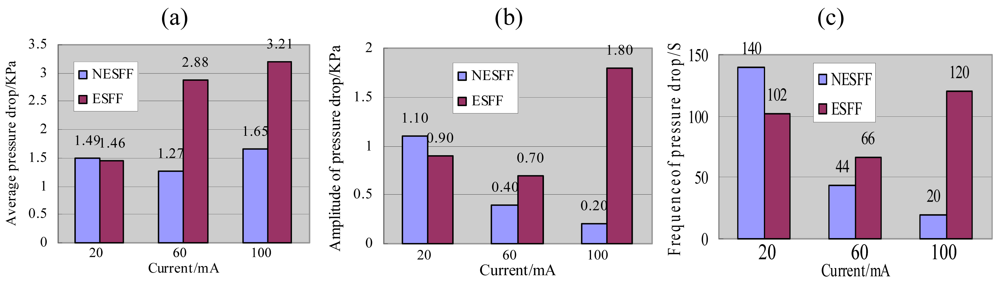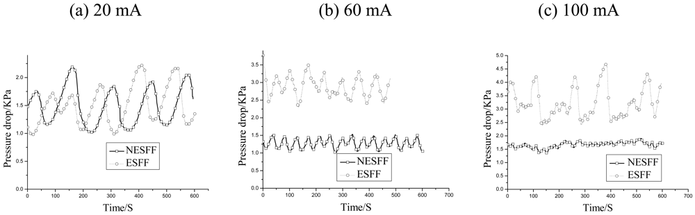 Figure 6 shows the time-history curves of the inlet-to-outlet pressure drops in the SEFF and NSEFF. The pressure drops were measured at currents of 20, 60 and 100 mA, respectively. It was observed that the pressure drops curves of the ESFF and NESFF were both in a periodically oscillatory form during the electrochemical reaction process. However, the pressure drop histories in NESFF and ESFF showed very different features with the change of the fuel cell current. It can be found from Figure.6(a) that the mean-value, amplitude and frequency of the pressure drop curves of NESFF and ESFF were very close at the current of 20 mA, because that the flow patterns in anode flow field were mainly bubbly flow at low fuel cell current, which conceal the bubble clogging effects in the micro channels. But when the current increased, the different trends of the pressure drop in NESFF and ESFF appeared [Figures 6(b) and 6(c)].
