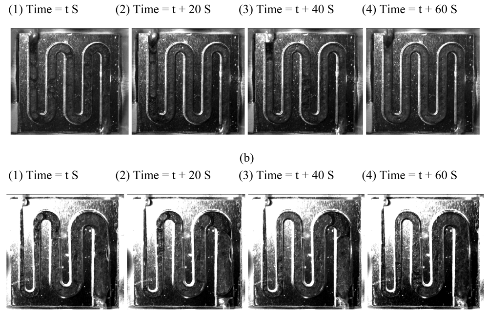 In order to obtain a better understanding of the features of the CO2 bubbles in the μDMFC, an image of the anode flow field was acquired using a real-time image acquisition system. The conditions of this experiment were similar to that of the pressure drop experiments. Before the image acquisition process, the output current of the μDMFC was firstly adjusted to a fixed value for 5 minutes until the fuel cell voltage was stable. The anode flow field images were sequentially recorded at a rate of 15 frames/s. Considering to the length limitation, only the sequential images at 100 mA with a time interval of 20 s are shown in this paper. Figures 8(a) and 8(b) are the anode images of the μDMFC with ESFF and NESFF patterns in a cycle of the pressure drop vibration, respectively. It can be found from Figure 8 that the shapes and distribution of the CO2 bubbles in the ESFF were more anomalous compared with those of the CO2 bubbles in the NESFF. This is because the tapered channels in the NESFF can provide additional confines to the coalescence and movement of the CO2 bubbles, which may in turn lead to a more orderly bubble behavior in the anode flow field. This result is in accordance with that of the pressure drop experiment mentioned above. On the other hand, the effects of different anode flow field pattern on the CO2 bubble accumulation and elimination also can be evaluated with the residual volume fraction (RVF) of bubbles in the anode flow field. Table 2 compares the RVF of bubbles in ESFF and NESFF at 20 mA, 60 mA and 100 mA. Results show that the RVF of bubbles in the two anode flow fields was similar at low fuel cell current (20 mA, 60 mA), but when the current increased to 100 mA, the RVF of bubbles in ESFF became strongly fluctuating (from 60%∼100%). Meanwhile, the RVF of bubbles in NESFF kept stable (approximately from 74% to 84%) even at a fuel cell current of 100mA. These experimental results also confirm the benefits of the NESFF to remove the CO2 bubbles in the anode flow field of the μDMFC.