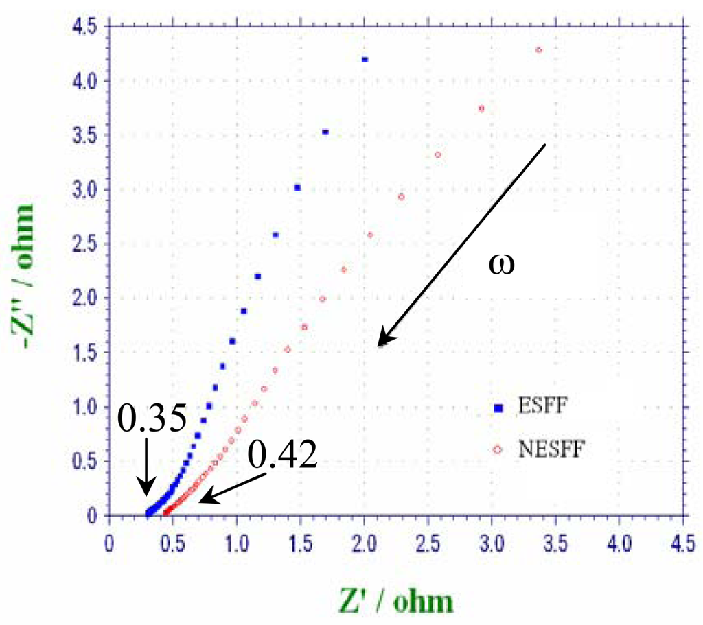 Nyquist plot of μDMFCs impedance with NESFF and ESFF