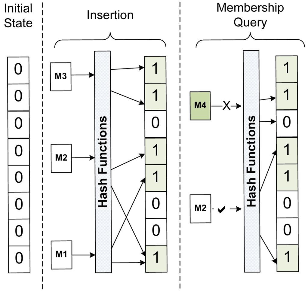 - Broder, A.; Mitzenmacher, M. Network applications of bloom filters: A survey. Internet Math. 2004, 1, 485–509. [Google Scholar]