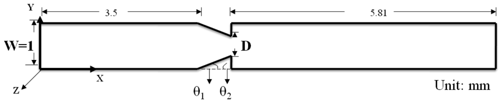 A numerical analysis software CFDRC 2009 was used as the simulation method in this study to research the effectiveness of NMPV under steady state fluid field conditions. The total length of NMPV under study is 10 mm; the main flow channel is set to 1 mm and uses an expansion mouthpiece or a nozzle mouthpiece as its main structure. The width of the expansion mouthpiece is designated as D and the expansion angles are θ1 and θ2, respectively, as shown in Figure 1. Structured Grid is used as the main method for the simulation analysis. It uses a finite element method to carry out the grid generation and calculate solutions based on continuous and momentum equations with matching boundary conditions.