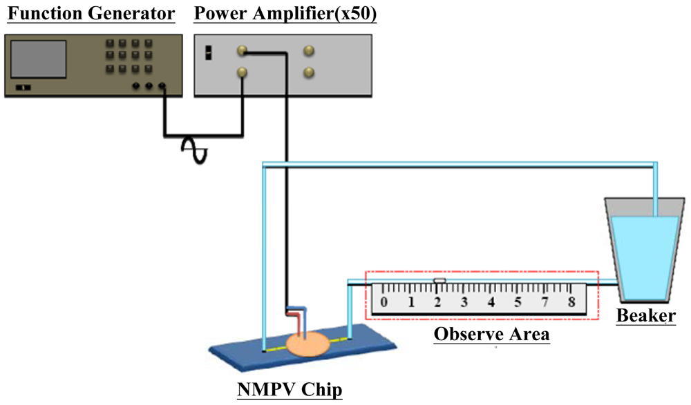 Finally, the manufactured SU-8 is used as master to finish the manufacturing process of the micro-pipe to be used in the NMPV micro-pump system through the PDMS mold method. The PDMS flow channel is then bonded with glass through a hot-press process. After packaging the PZT actuator, fluid entrance/exit, and PDMS flow channel, the manufacturing of the NMPV micro-pump system is considered complete. The micro-pump system is shown in Figure 9, while Figure 10 shows a diagram of the experimental setup. A piezoelectric buzz film is used as the pressure source to drive the NMPV micro-pump system. The experiment will use a signal generator to provide the frequency required to drive the fluid. Then, the signal will be amplified by a voltage amplifier and connected to a microscope through CCD so that the movement of the bubbles in the micro-tube can be observed and images captured. The net flow is estimated according to the bubble moving distance within the micro-tube.