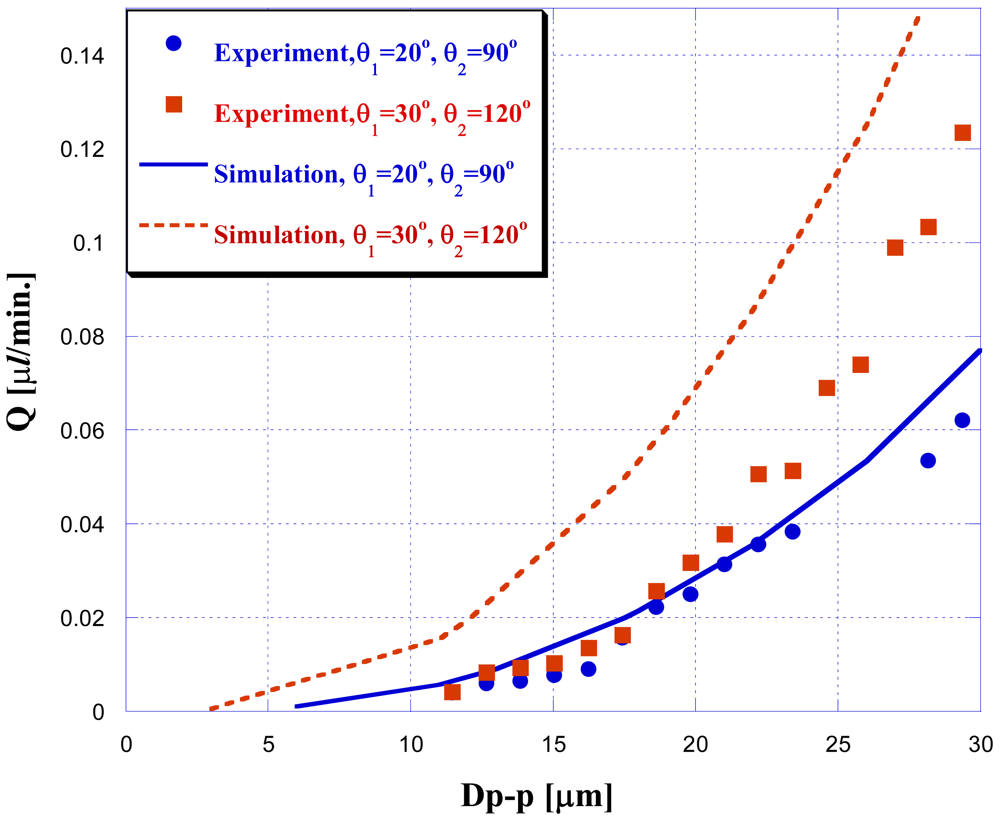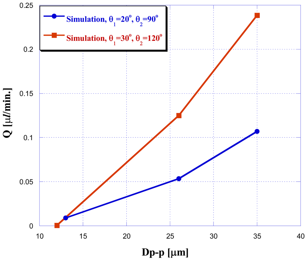 In the literature, all different expansion valve angles studied by Gerlach et al. [11] are able to generate a one-way valve effect. Therefore, in this study the expansion angles of an expansion valve with a diffuser width, D = 500 μm, is varied to conduct a series of investigations to find out the best design angles and operating conditions for the expansion valve.
