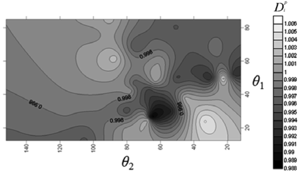 First, D = 500 μm is fixed for the NMPV to investigate the relationship between different flow channel speeds and the angles of the expansion valve. From Figure 3, it is found that Dp,i exhibits a relatively irregular distribution at Reynolds number, ReD = 5. When it is increased to ReD = 20, it shows that there exists a larger Dp,i area on the contour line map from Figure 4. Similarly, there also exists a larger Dp,i area in the same direction at ReD = 50 and ReD = 75.